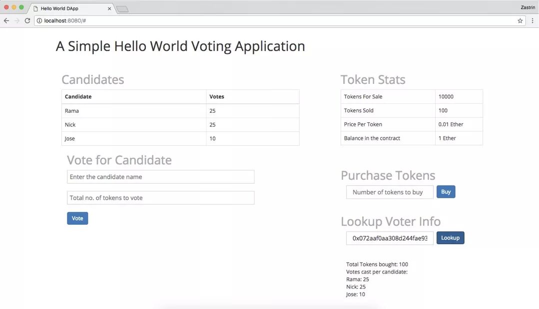 如果一切顺利,你可以看到网页,可以输入一个账户地址(投票人的地址),观察他们的投票行为和股票通证数量的变化。 并且可以购买更多的股票通证,为任意候选者投票并查看投票人信息。