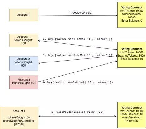 以下是我们将要在本章实现应用的图示,任何人都可以调用合约的 buy()方法来购买公司发行的股票通证,然后就可以调用合约的 voteForCandidate()方法为特定的候选人投票: