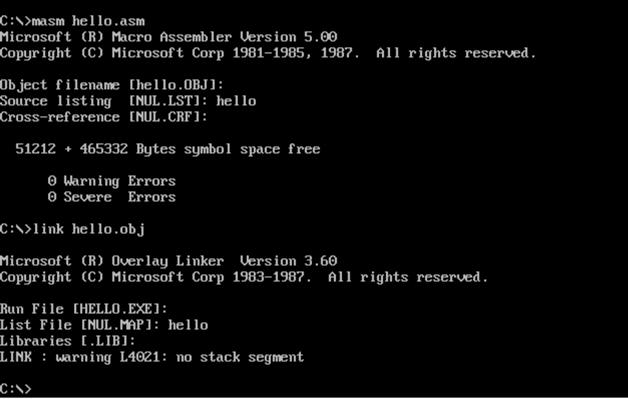 - 利用masm命令对源文件进行汇编:输入masm命令后连续回车4次,此时汇编生成二进制目标文件hello,obj