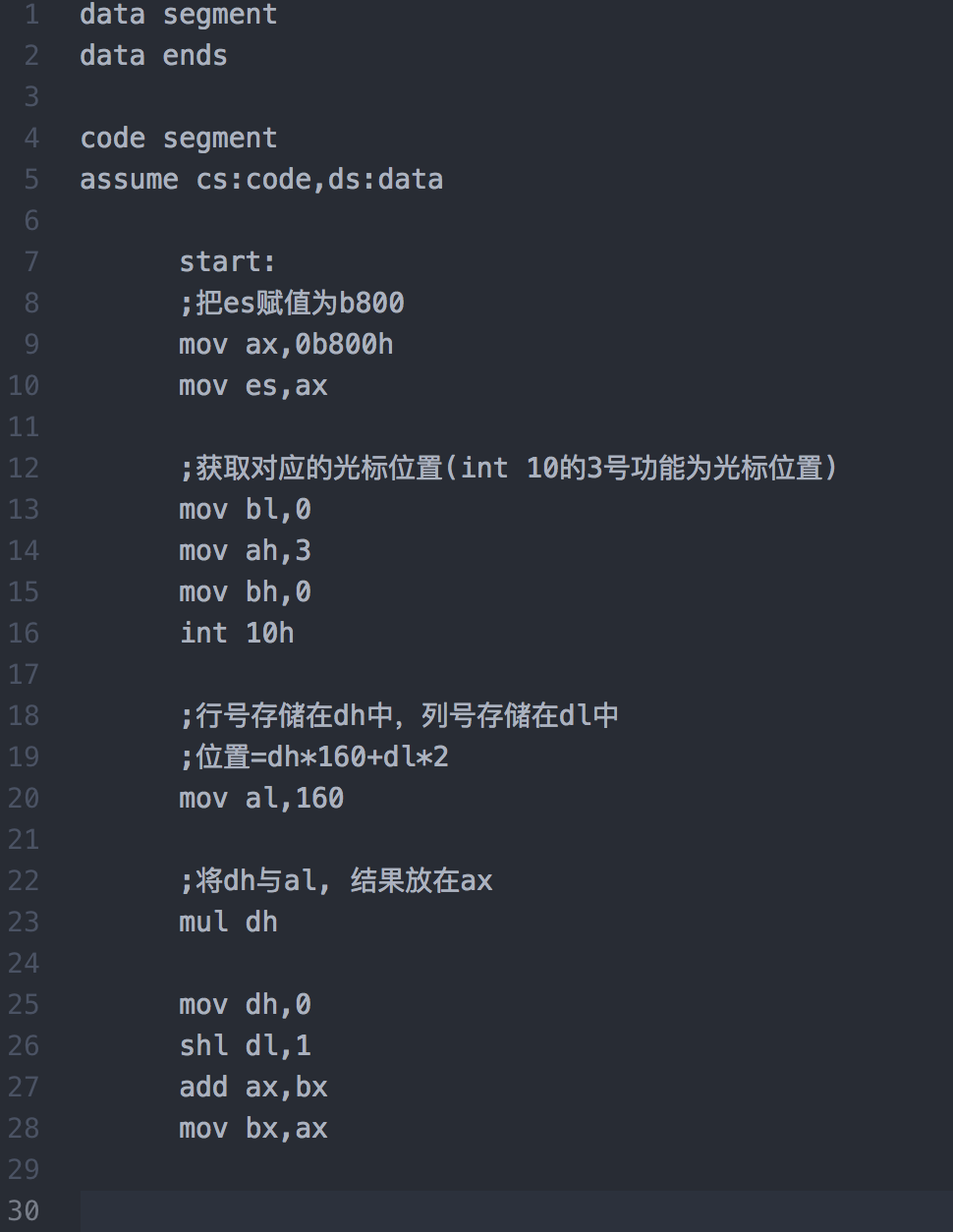 - int 10的3号功能为光标位置,会把行号存储在dh,列号存储在dl中,然后显示字符