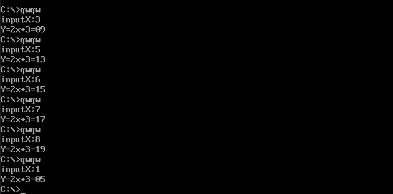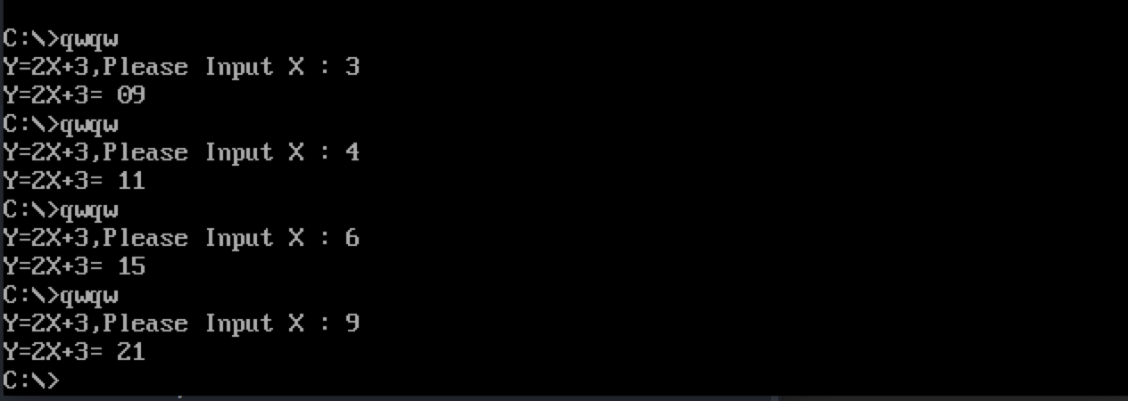 4.实现Y=2X+3,X是一位十进制数。要求X从键盘输入,在下一行上显示“Y=2X+3=”以及十进制计算结果-关键在溢出问题上