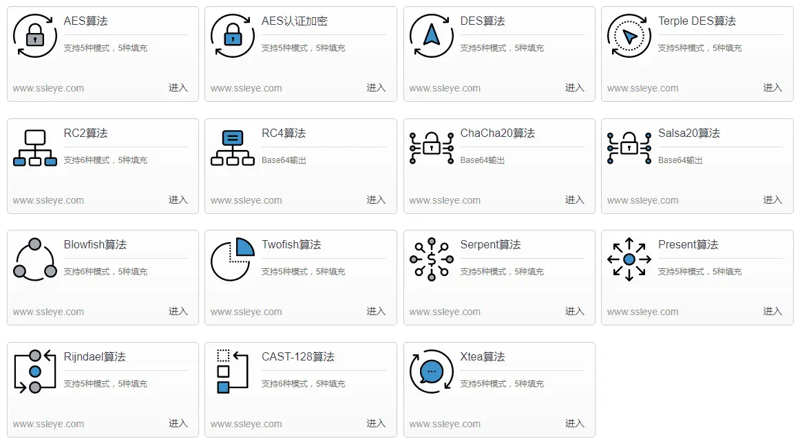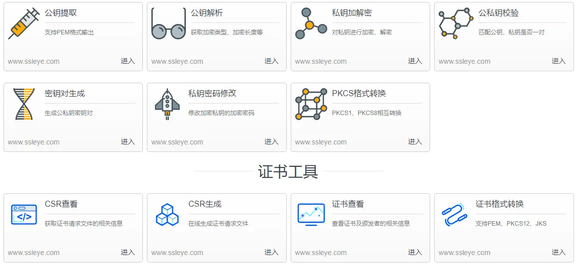 - SSL在线工具(已完结),网址:www.ssleye.com,对称加密算法、非对称加密算法、证书相关工具以及SSL检测等。