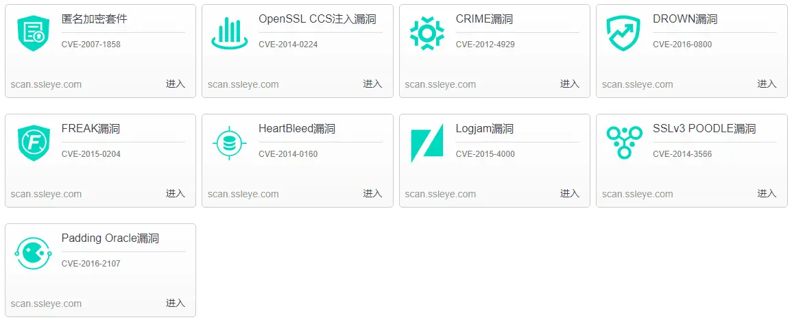 SSLcve-SSL漏洞在线检测工具(scan.ssleye.com),支持9种SSL漏洞检测,如匿名加密套件、Poodle漏洞、Drown漏洞、CCS注入漏洞、Padding Oracle漏洞等。
