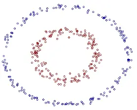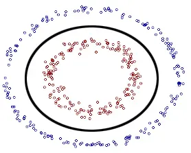 在这个图中,我们想要将红色与蓝色分隔开来。线性分类不可行,使用一个椭圆形的分类比较好。类似这样的: