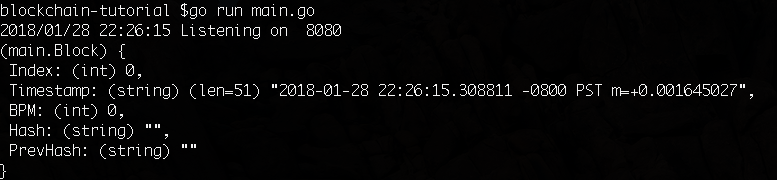 godotenv.Load()允许我们从根目录中的.env文件中读取像端口号这样的变量,这样我们就不必在整个应用程序中对它们进行硬编码(恶心!)。genesisBlock是main函数中最重要的部分。我们需要为我们的区块链提供一个初始区块,否则新区块将无法将其先前的散列与任何东西比较,因为先前的散列并不存在。- 我们将初始块隔离到它自己的 Go 例程中,这样我们就可以将关注点从我们的区块链逻辑和 Web 服务器逻辑中分离出来。但它只是以这种没有 Go 例程情况下作更优雅的方式工作。