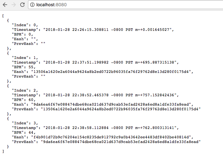 我们只需以 JSON 格式回写完整的的区块链,就可以通过访问 localhost:8080 在任意浏览器中能够查看。我们在 .env 文件中将 ADDR 变量设置为 8080,如果您更改它,请确保访问您的正确端口。