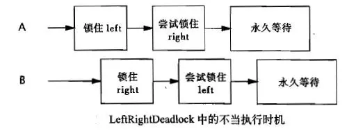 如果执行时序不当,那么A可能获得myAccount的锁并等待yourAccount的锁,然而B此时拥有yourAccount的锁并正在等到myAccount的锁。