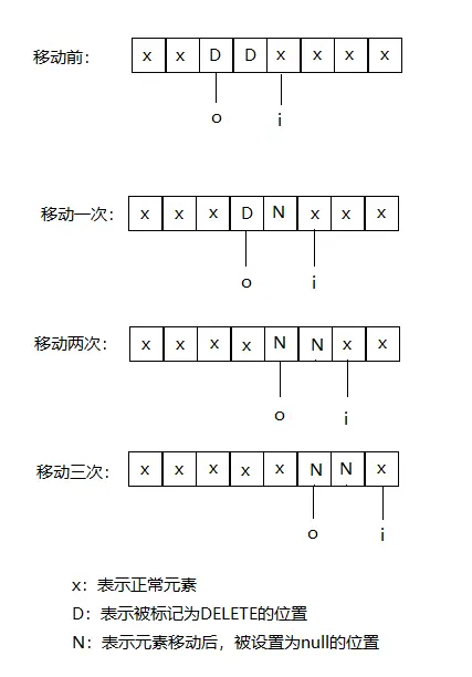 // 很简单,就是遍历整个数组,将值是DELETED后面的元素前移,覆盖掉DELETED所在位置