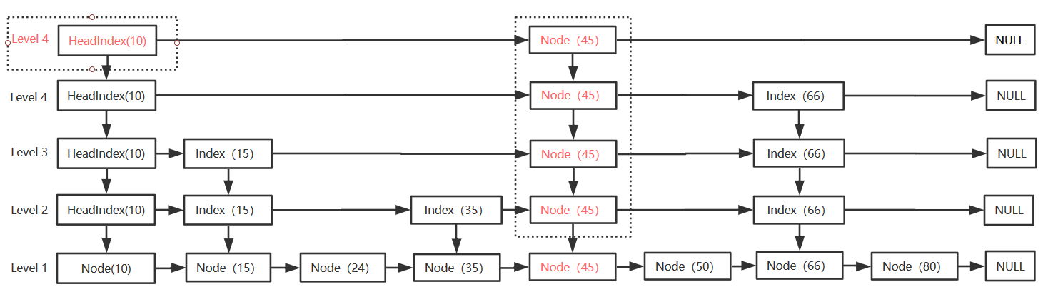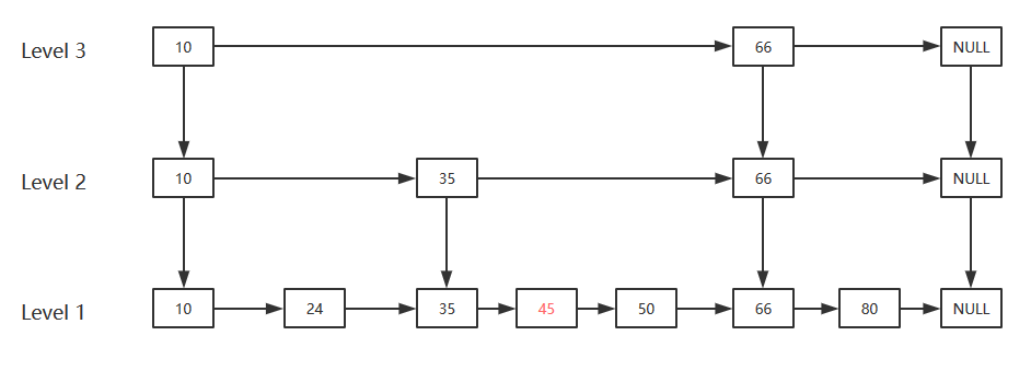 先来说不大于当前层数的处理。因为当前level值是3,所以只会将45这个节点添加到前3层,因此会先创建一个从上往下的链表,又因为基础层不需要再添加了,所以链表节点只有两个: