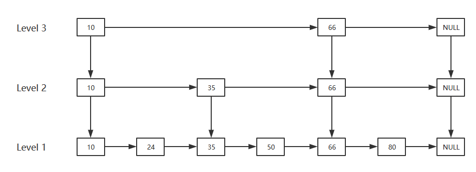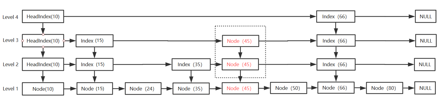 然后再将这个链表结构添加到上面的跳表中,最终结果如下: