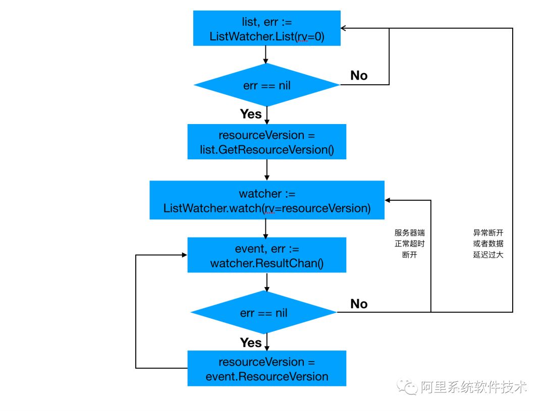 watch请求开始之前,先发起一次list请求,获取集群中当前所有该类数据(同时得到最新的ResourceVersion),之后基于最新的ResourceVersion发起watch请求。