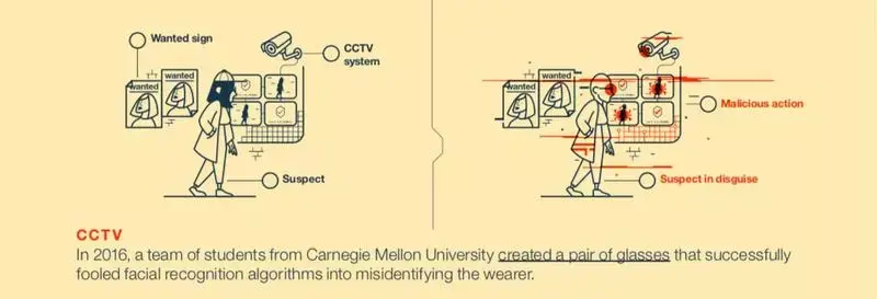 2016 年,卡耐基梅隆大学的一帮学生设计了一个眼镜,并成功蒙骗了人脸识别算法,使之将戴眼镜的人识别成另一个完全不同的人。