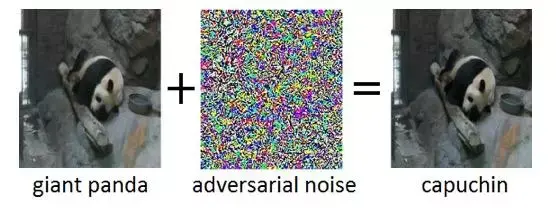 图 1 对抗样本(右)通过在原始输入(左)上加入对抗噪声(中)来获得。尽管对抗样本中加入的噪声对人类来说几乎感觉不到,却可以让深度神经网络将图片误分为“僧帽猴”而不是“大熊猫”。