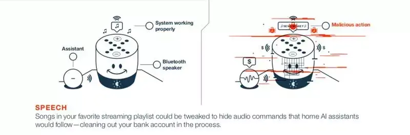 全球知名科技媒体 TNW(The Next Web)在今年早些时候对上图所示的语音系统漏洞进行过报道,黑客能够通过特定的方式欺骗语音转文本系统,比如在你最喜爱的歌曲中偷偷加入一些语音指令,让智能语音助手清空你的银行账户。黑客并不一定须要由你从收藏的播放列表中选择特定歌曲,他们可以在公共交通工具上或者在办公室里坐在你对面,假装自己在听音乐,然后偷偷嵌入攻击信号。