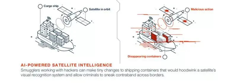 对抗性攻击带来的威胁还包括欺骗 GPS 误导船只、攻击舰载系统、伪装船只 ID 来欺骗 AI 驱动的人造卫星等等。AI 系统容易受到攻击的领域还包括无人驾驶汽车和军用无人机,如果它们的安全受到威胁,这两者都可能成为黑客的武器。