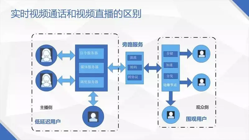 视频直播:采用 CDN 为围观观众分发内容,延迟相对较高,CDN 成本较低;