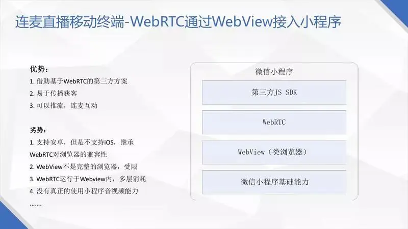 这个方案利用了微信小程序最近推出的 WebView 组件来承载基于 WebRTC 的应用。小程序的 WebView 是否支持 WebRTC 呢?我的答案是:支持,也不支持。 WebView 在安卓端支持 WebRTC ,在 IOS 端不支持 WebRTC ,而且在安卓端的 WebView 还不是完整的浏览器,所以功能会受限。因此,这个方案虽然讨巧地借用 WebView 来承载基于 WebRTC 方案,但它也带来下面几个问题: