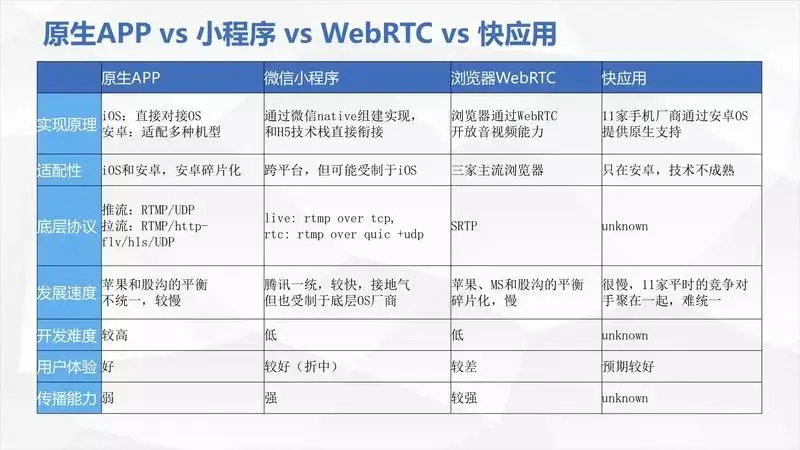 上面分享了如何在微信小程序上实现连麦直播或视频通话,同时将连麦直播技术覆盖到原生 APP 和 WebRTC 浏览器上。因此,我把原生 APP 、微信小程序、WebRTC 浏览器、以及最近推出的快应用都列在了上图,在几个方面进行了对比。