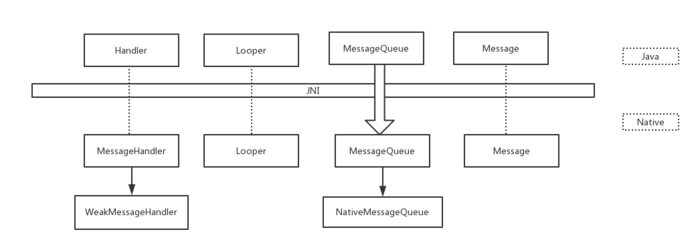 Java 层和 native 层通过 MessageQueue 里面持有一个 native 的MessageQueue 对象进行交互。WeakMessageHandler 继承自MessageHandler,NativeMessageQueue 继承自 MessageQueue