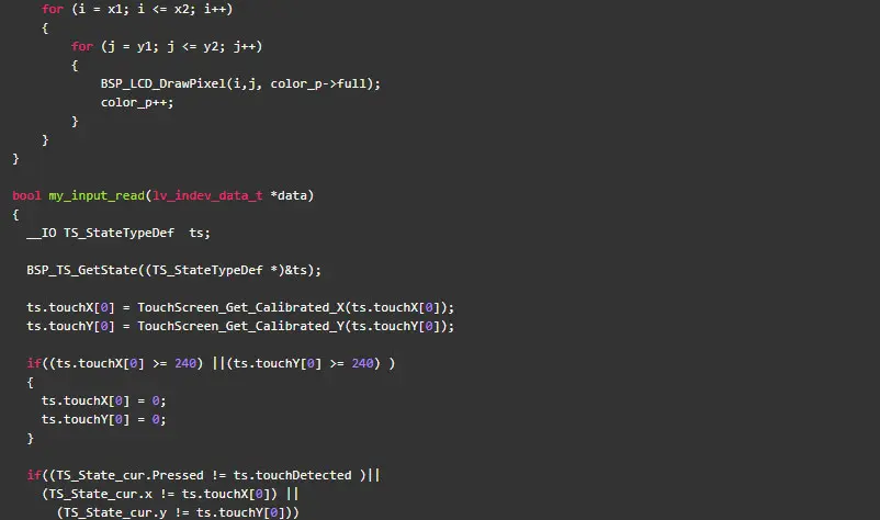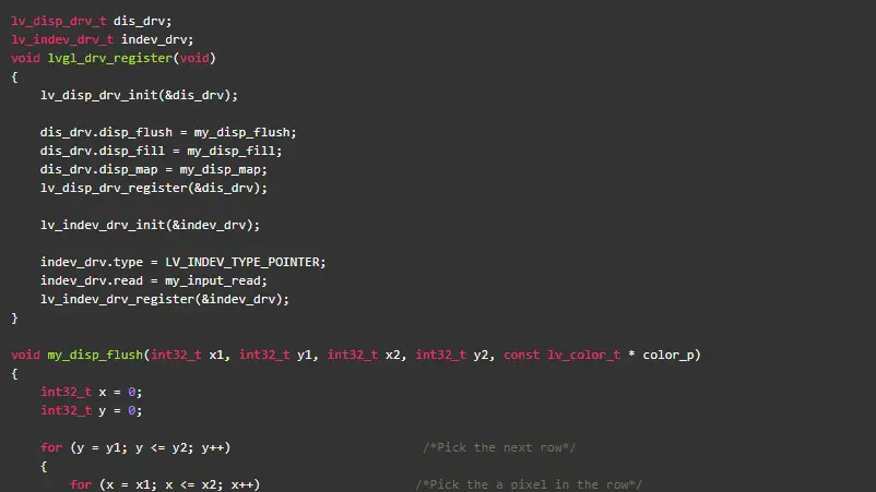 e、调用lv_disp_drv_init初始化显示驱动,调用lv_disp_drv_register注册显示驱动。调用lv_indev_drv_init初始化输入驱动,调用lv_indev_drv_register注册输入驱动,示例代码见附录。