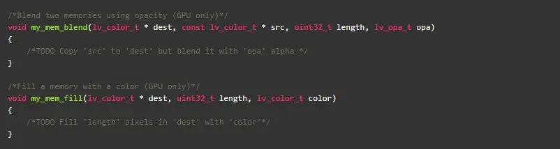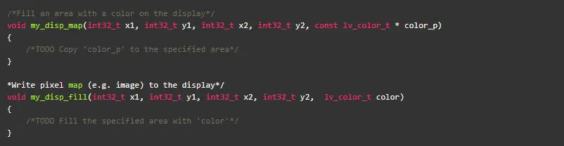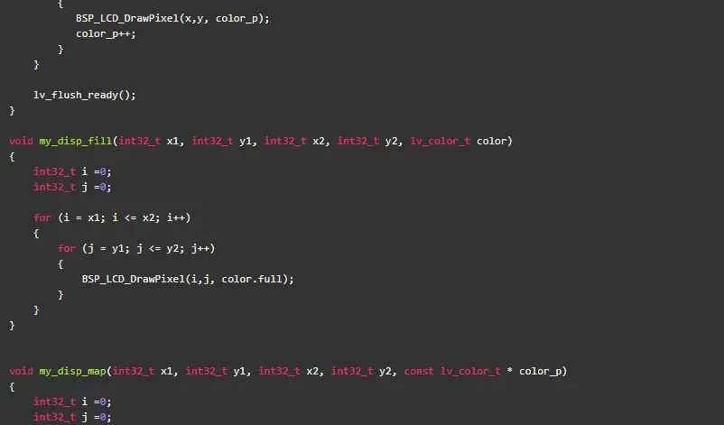必须实现如下函数,其功能为对一片矩形区域填充颜色,注意该函数的最后必须调用lv_flush_ready()函数。