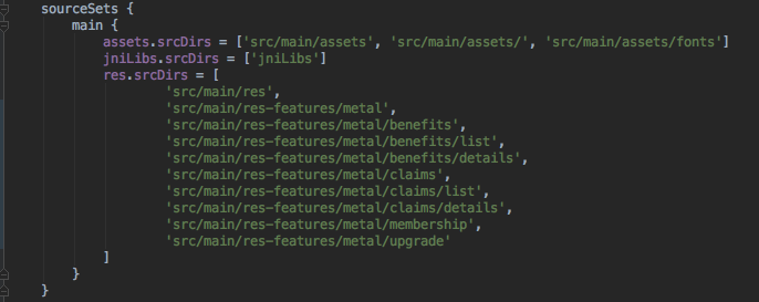 我们需要让Android Studio查找新的目录而不是默认的“res”下来查找资源文件。为此,请转到build.gradle文件并找到对应每个屏幕的sourceSet和 目录: