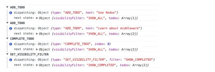 试想一下,当我们的应用中每一个 action 被发起以及每次新的 state 被计算完成时都将它们记录下来,岂不是很好?当程序出现问题时,我们可以通过查阅日志找出是哪个 action 导致了 state 不正确。