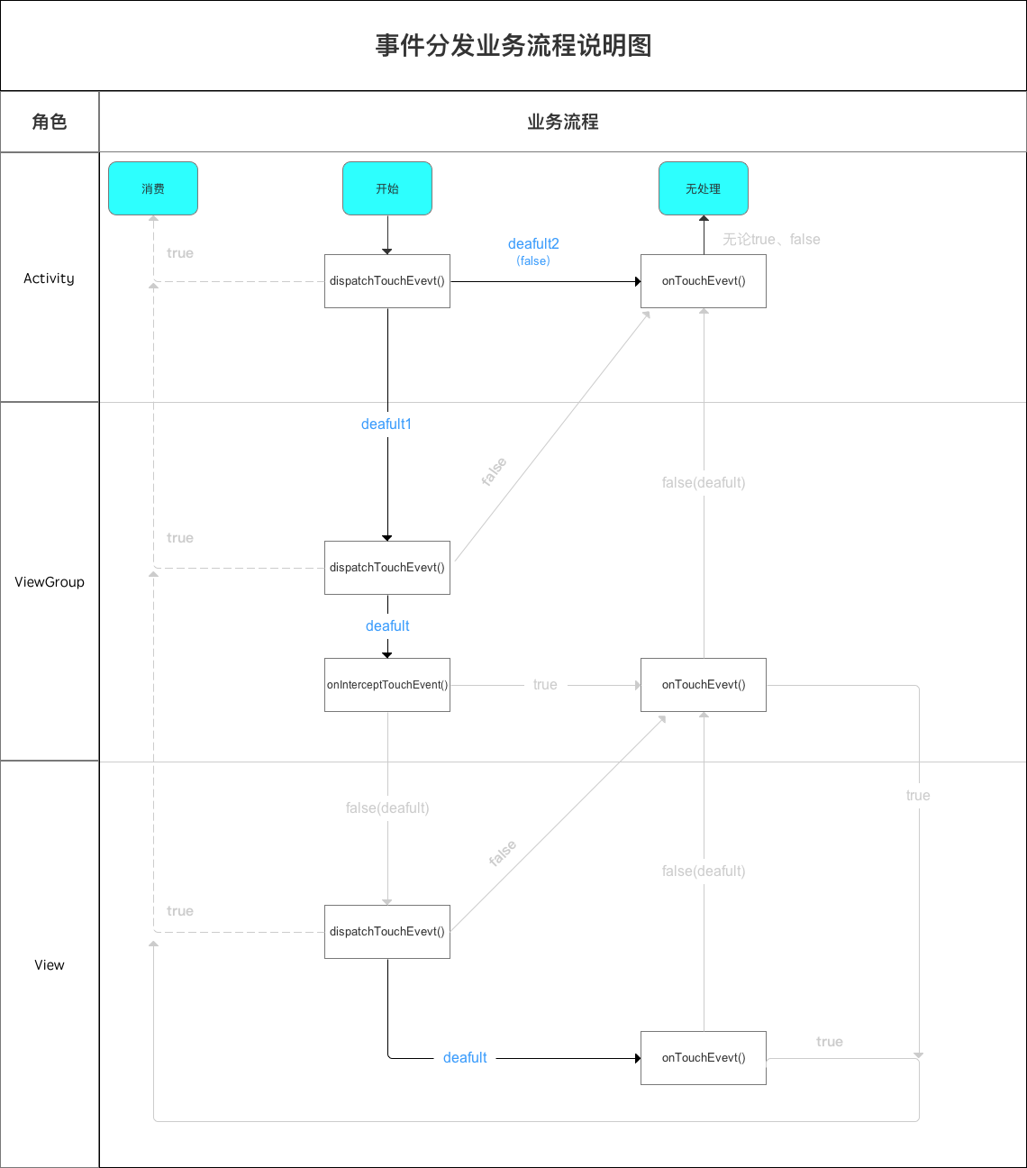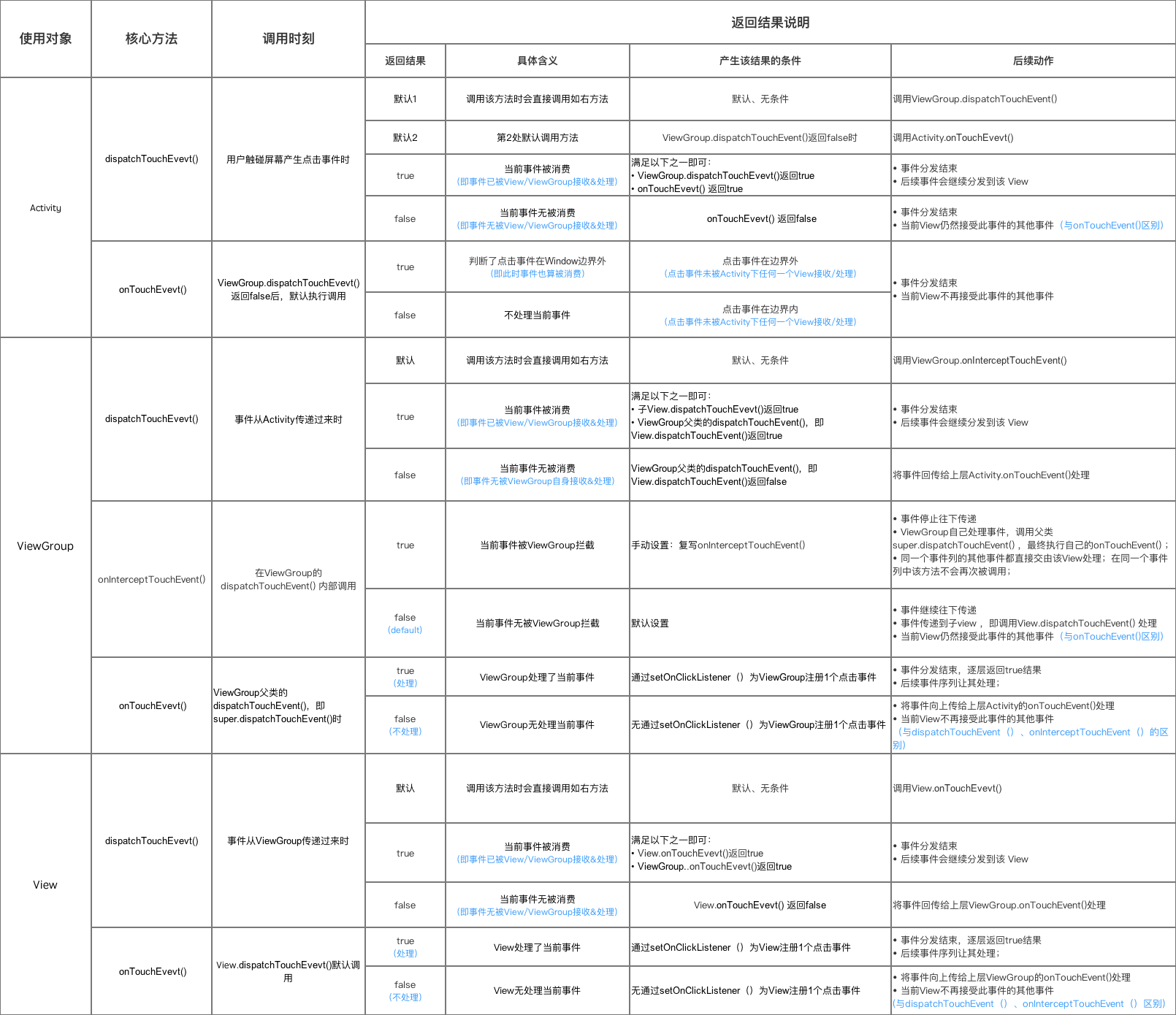 dispatchTouchEvent()、onTouchEvent()、onInterceptTouchEvent())进行重写 或 更改返回值 - 那么调用的是这3个方法的默认实现:调用下层的方法 & 逐层返回