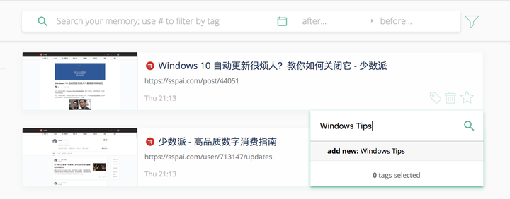 在历史记录或 Memex 选单中,你还可以为页面添加特定标签,也就是上文中的 Tags 过滤器。以后只要输入 #标签名称,就能随时定位了。
