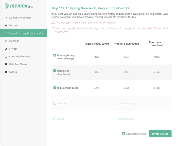 在 Memex 的设置中,你还可以导入之前的书签和历史记录,不再遗漏半点信息。