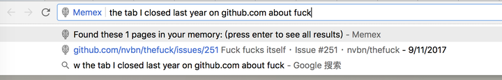 如果你觉得记住上面的语法有点难度,不妨试试直接用自然语言描述。例如,the tab I closed last year on github.com about fuck 就能准确定位我去年在 GitHub 上浏览到的有关 fuck 的内容。