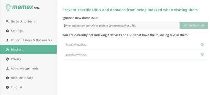 访问记录里有见不得人的网站?你只需要点击工具栏上 Memex 的图标,或者进入设置界面,将其加入黑名单即可。如果你要长时间进行地下工作,也可以设置在一段时间内暂停索引。
