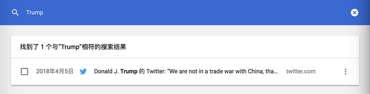 以川皇为例,使用 Chrome 原生历史记录搜索功能时,我们只能找到一条孤零零的 tweet;而使用 Memex 时,还能同时找到三十余个正文提到 Trump 的网页,并配合页面预览,帮助你快速拾起回忆。