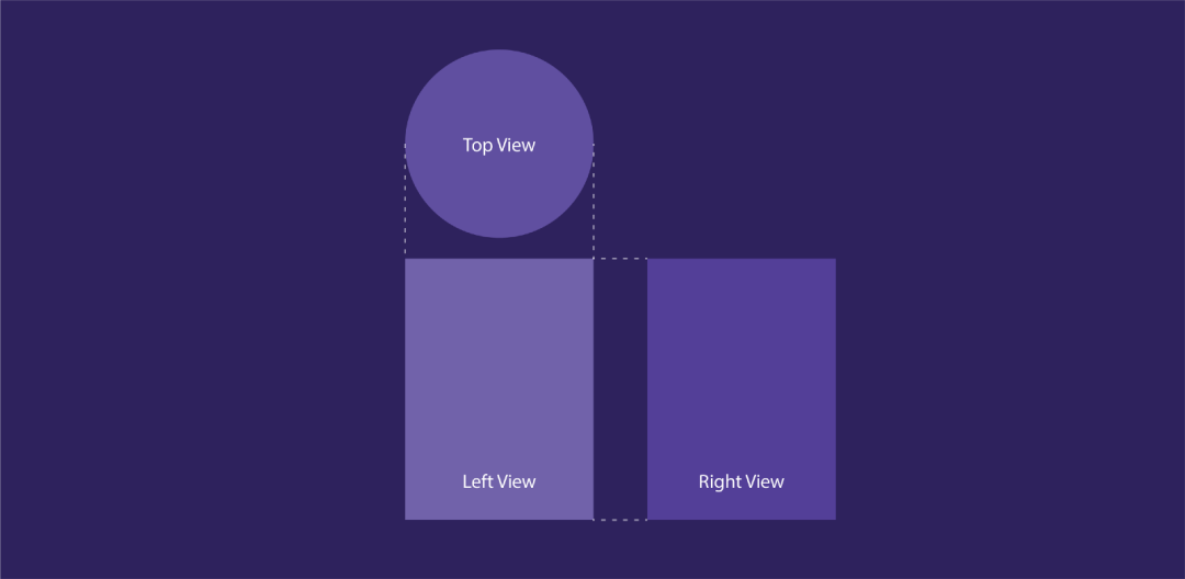 我上一篇文章中所说,我们先绘制圆柱体的顶视图、正视图、侧视图。由于这是一个顶部为圆形的普通圆柱体,所以正视图和侧视图将是一样的。我使用了不同的颜色,目的是为了区别它们。