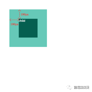 <!DOCTYPE html><html lang="en"> <head> <meta charset="UTF-8"> <title>position demo</title> <style> html, body { width: 100%; height: 100%; margin: 0; padding: 0; color: #fff; font-size: 30px; } .parent { /* 关键代码-start */ position: relative; /* 关键代码-end */ width: 400px; height: 400px; margin: 100px; background-color: #66C9B8; } .child { /* 关键代码-start */ position: absolute; left: 100px; top: 100px; /* 关键代码-end */ width: 200px; height: 200px; background-color: #055F50; } </style> </head> <body> <div class="parent"> <span class="child">child</span> </div> </body> <script></script></html>
