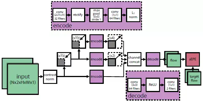 图 3:动态流卷积神经网络。该 ConvNet 基于面向时空的能量模型 [7,39],同时经过光流预测的训练。图中显示了三个扩展(scale),实践中研究者使用了五个扩展。