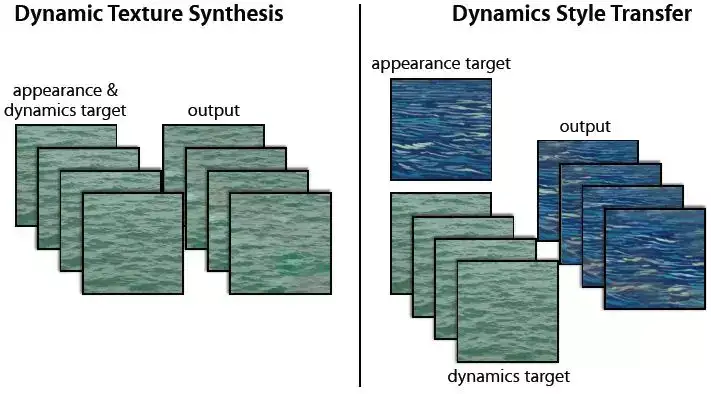 很多常见的时序视觉模式使用组成元素的外观和动态(即时序模式变化)的集合进行描述。此类模式包括火、摇曳的树木和波浪起伏的水。长期以来,理解和特征化这些时序模式是人类感知、计算机视觉和计算机制图领域感兴趣的问题。之前的研究给这些模式起了很多名字,如涡流运动(turbulent-flow motion)[17]、时序纹理(temporal texture)[30]、时变纹理(time-varying texture)[3]、动态纹理 [8]、纹理运动(textured motion)[45] 和时空纹理(spacetime texture)[7]。本论文作者使用「动态纹理」(dynamic texture)。该研究提出从外观和时序动态的角度对动态纹理进行因子分析。然后使用因子分解结果完成基于示例纹理输入的动态纹理合成,从而生成新型动态纹理实例。它还产生了一种新型风格迁移形式,目标外观和动态可来自不同来源,如图 1 所示。