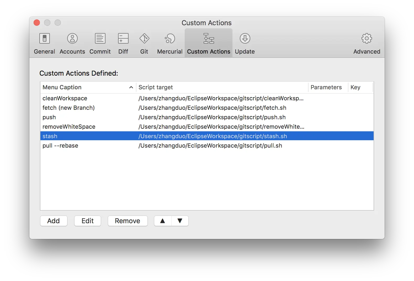 sourceTree 是一款优秀的 git 管理客户端,不仅已经包含了很多常用操作,而且可以还添加 shell 脚本来订制自定义动作,大大节省了时间。
