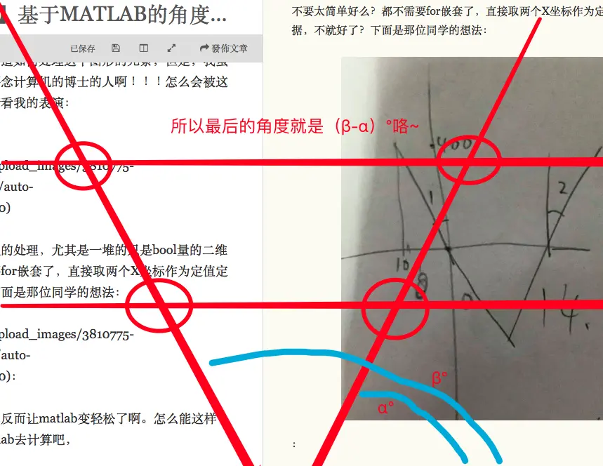 我觉得,这样是给自己增加了工作量,反而让matlab变轻松了啊。怎么能这样呢?不存在的!!所以还是直接让matlab去计算吧,直接用两点确定一条直线的方式,给两条直线分别求出来斜率,然后在视觉的绝对坐标系下转化为角度,最后就得到咯~~: