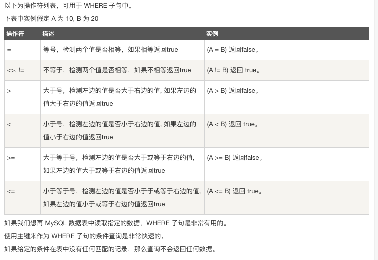 where 子句类似于程序语言中的 if 条件,根据 MySQL 表中的字段值来读取指定的数据。