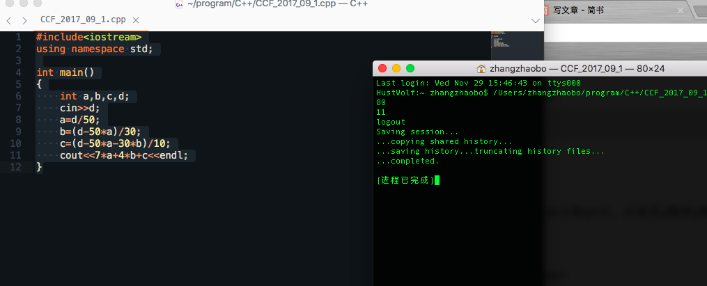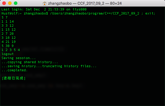 HustWolf:~ zhangzhaobo$ /Users/zhangzhaobo/program/C++/CCF_2017_09_1 ; exit;
