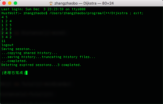 HustWolf:~ zhangzhaobo$ /Users/zhangzhaobo/program/C++/Dijkstra ; exit;