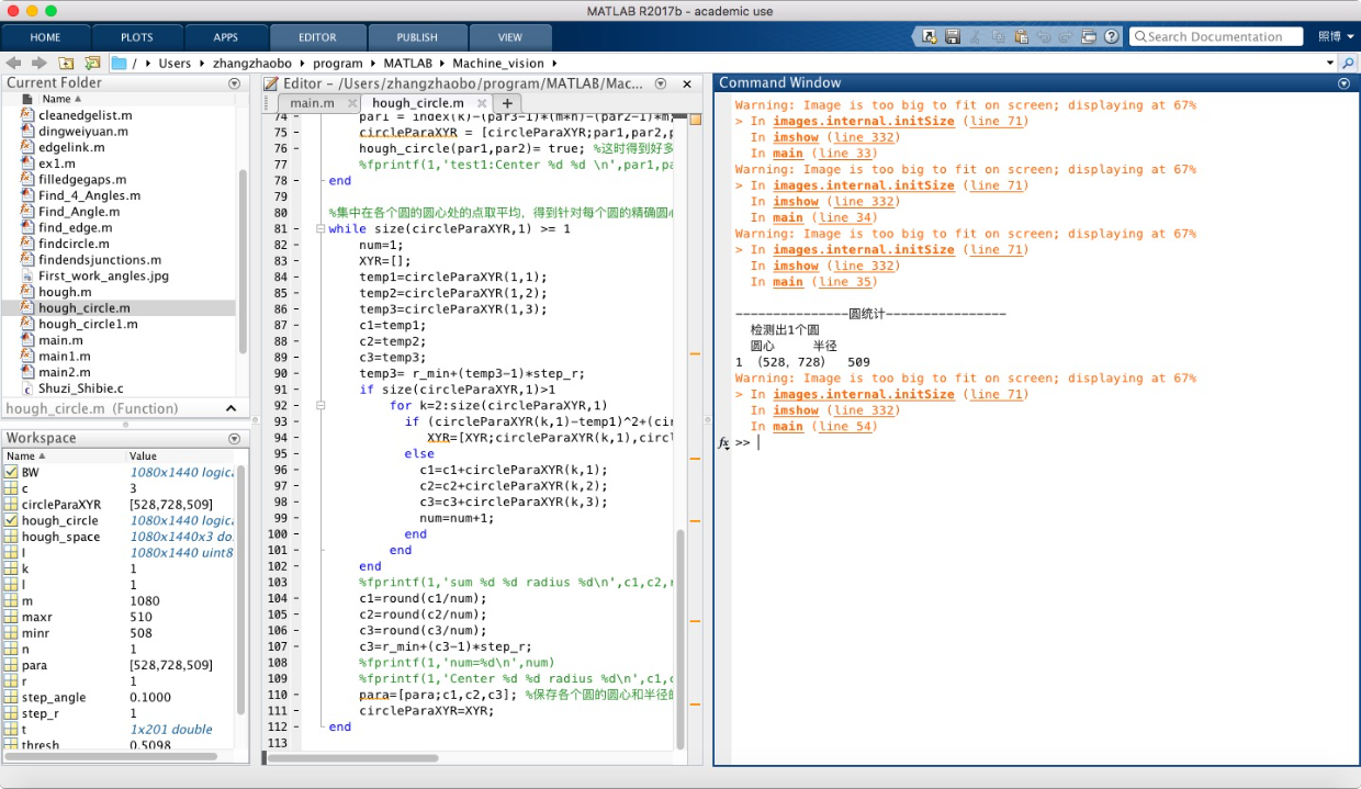 上面是👆main函数,也就是最终的直接调用的函数,下面是hough_circle的m函数,在main中要调用这个函数的!
