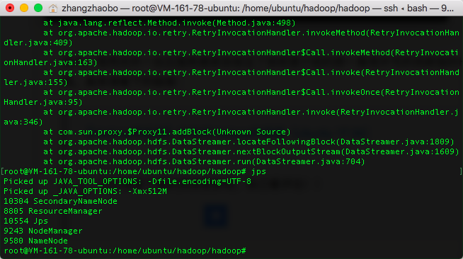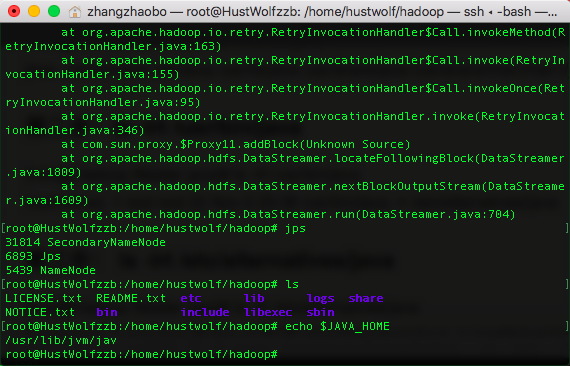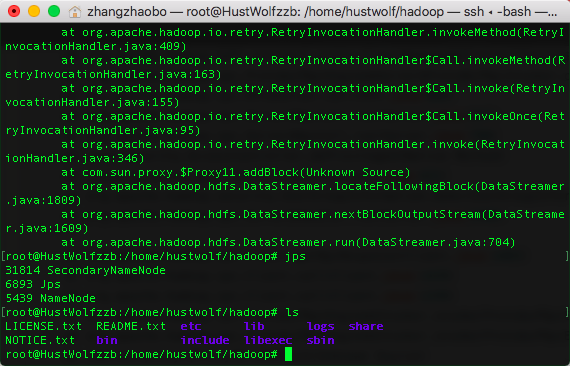 从上方图片可以看出来。当我运行gps命令的时候。是完全可以显示出Hadoop需要的那些组件的。理论上来说应该可以完成那个问题。但是我也不知道为什么,总是有bug!!!