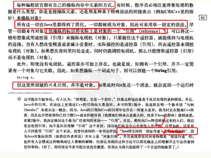 每一种编程语言都有自己操纵内存中元素的方式,这确实是的。在C++中,指针和引用曾经把我虐的死去活来。至于新版的C++11,更是多了一个智能指针。虽然我都差不多理解了,但是现在没用,因为是在学Java的话,就要看Java的。我总算明白为什么那么多人喜欢Java了,因为它大大的简化了对内存的操作,统一使用引用这一概念。我觉得在注释中,“Java所支持的按址传递是完全错误的”,这一说法我觉得对于初学者来说简直是当头一棒。因为按照按址传递这一个说法的话,可以很容易的理解,但是如果直接说他是错误的,那么我们很难想到另外一种概念来抽象出Java对于对象的操纵方式。