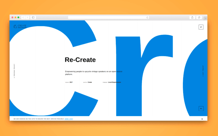 今年,大标题,巨大的字体与流畅的动画结合在一起。如果将这种趋势用于网站 - 即使没有任何内容,它也会显得引人注目。这是因为排版可以取代内容,而且看起来很棒。Re-Create网站就是这种趋势的一个很好的例子。
