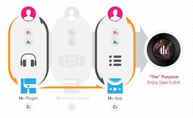同之前的一样,用户首先要达成的目的(P1)是事先做好自己一个人才能听到音乐的私密听觉空间的准备,带着这个子需求,用户将耳机线插入对应的手机耳机孔(A1),但此时的媒介,也就是这台搭载iOS9的手机硬件(M1),将当前场景下用户插入耳机这一行为输入进行了分析和解读,预判用户下一个场景是要找到音乐播放应用,而这一操作实际是为了再下一个场景在那个应用里选歌收听的,在后台(Backstage)完成这一连串的“思考”后,手机硬件(M1)作为当前场景被输入的对象,不但常规地、响应地向当前场景的用户输出了硬件体感上的反馈,同时向手机内的默认音乐应用(M2)输出了在下一场景直接唤起的需求指令;