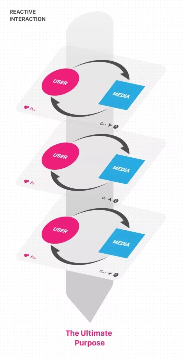 需要指出的是,基于这层基础理论所反映出来的、也是大多时候我们所讨论的,其实是一种“被动响应式的交互方式“(Reactive Interaction)是常规、基础、机械的交互方式:在当前场景下,用户产生一个需求(也就是目的),然后通过行为向媒介输入需求,媒介被动响应给予输出反馈,在完成这一闭环后,到下一个场景出现时,再进行下一个阶段的用户主动输入、媒介被动响应的交互过程,一环环直到达成用户的最终目的。这是一种仅聚焦同一独立场景维度,且线性闭合的交互设计思维,如下图所示。