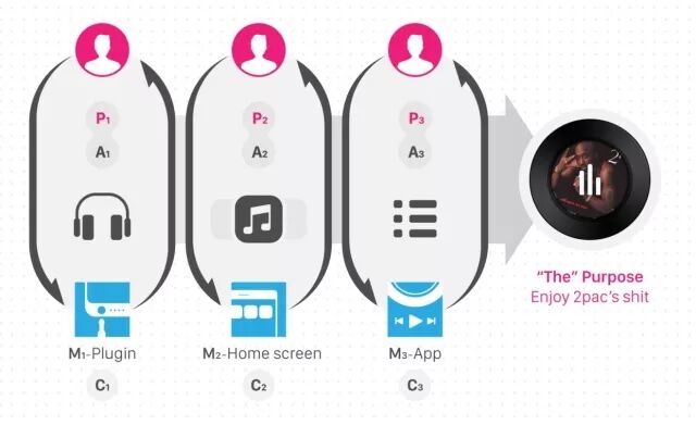第二个场景,用户其次要达成的目的(P2)是在繁杂的手机应用中找到合适的音乐播放应用,带着这个子需求,用户在手机系统界面环境下进行滑屏、搜索等动作来找到那个音乐应用(A2),此时的媒介是这台手机的系统操作界面(M2),用户找到音乐应用后,进入下一阶段;