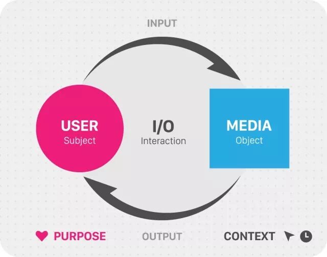 我们知道,用户和产品之间的交互有个基本的逻辑关系:用户(User)在某种特定场景(Context)下通过媒介(Media)的使用行为(Action)来完成某个目的(Purpose)。其中用户、场景、媒介、行为、目的也被称为交互设计中的五个基本要素,分别用来定义who、where&when、what、how以及why。而在这组关系中,用户和媒介通常扮演着一组交互对象中的主体(Subject)和客体(Object),主体向客体作行为输入(其实也就是需求输入),对应地,客体向主体作反馈输出(来响应这个需求),如图所示。